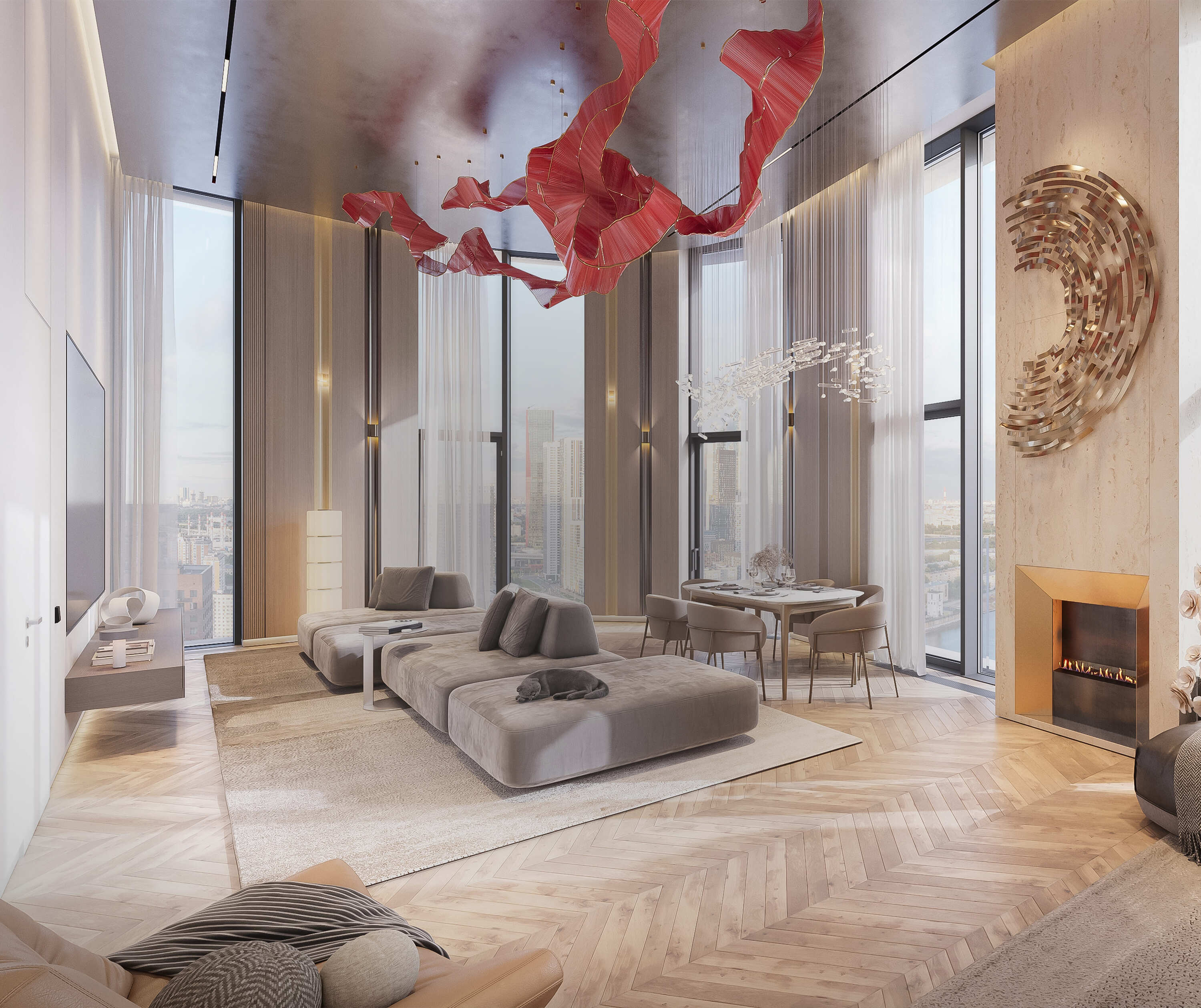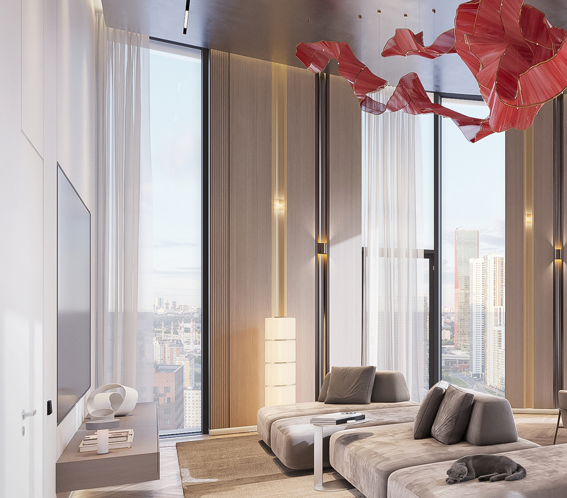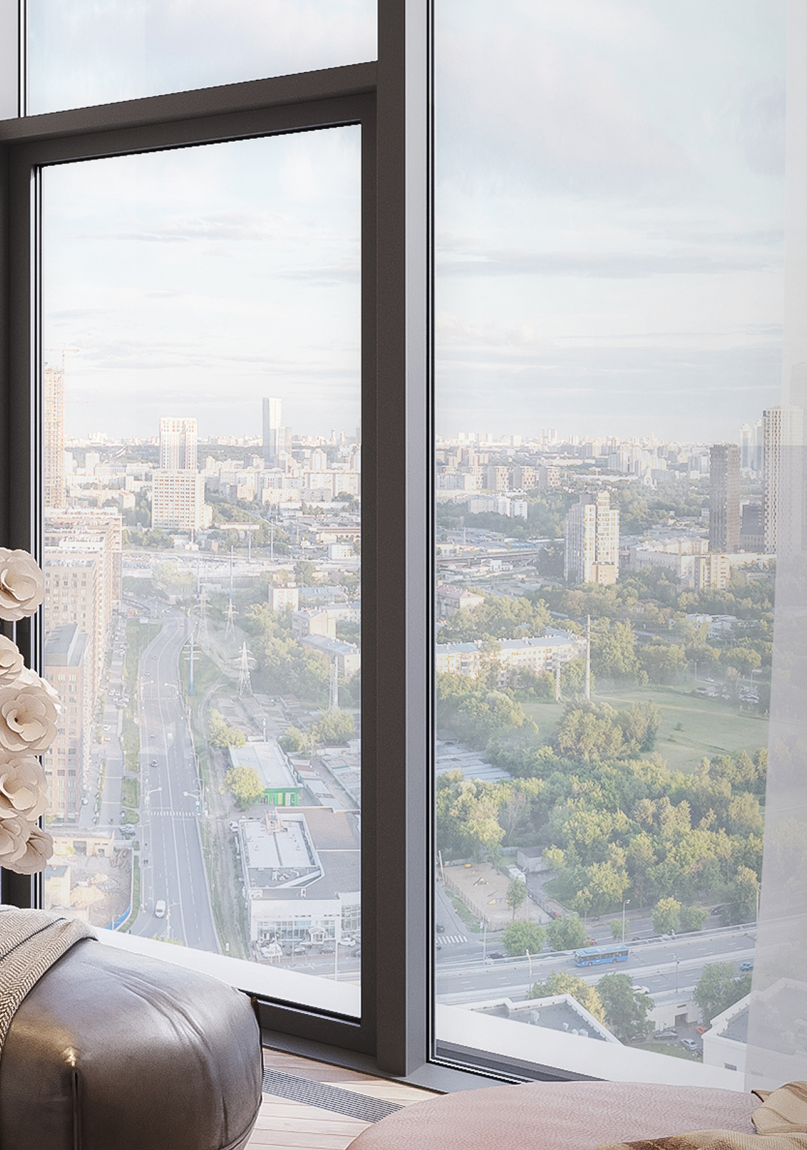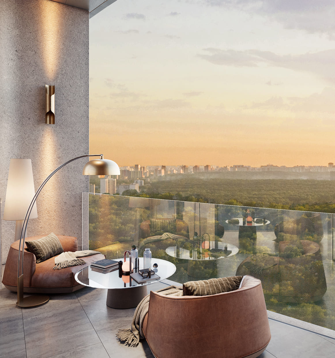 Светлые 5-метровые окна открывают безграничные панорамы. Природа стремится стать драгоценной изюминкой ваших интерьеров, впуская в эти окна всю красоту небесных пейзажей. А собственная лоджия превращается в ваш личный зелёный сад, парящий над землёй на высоте более 90 метров.