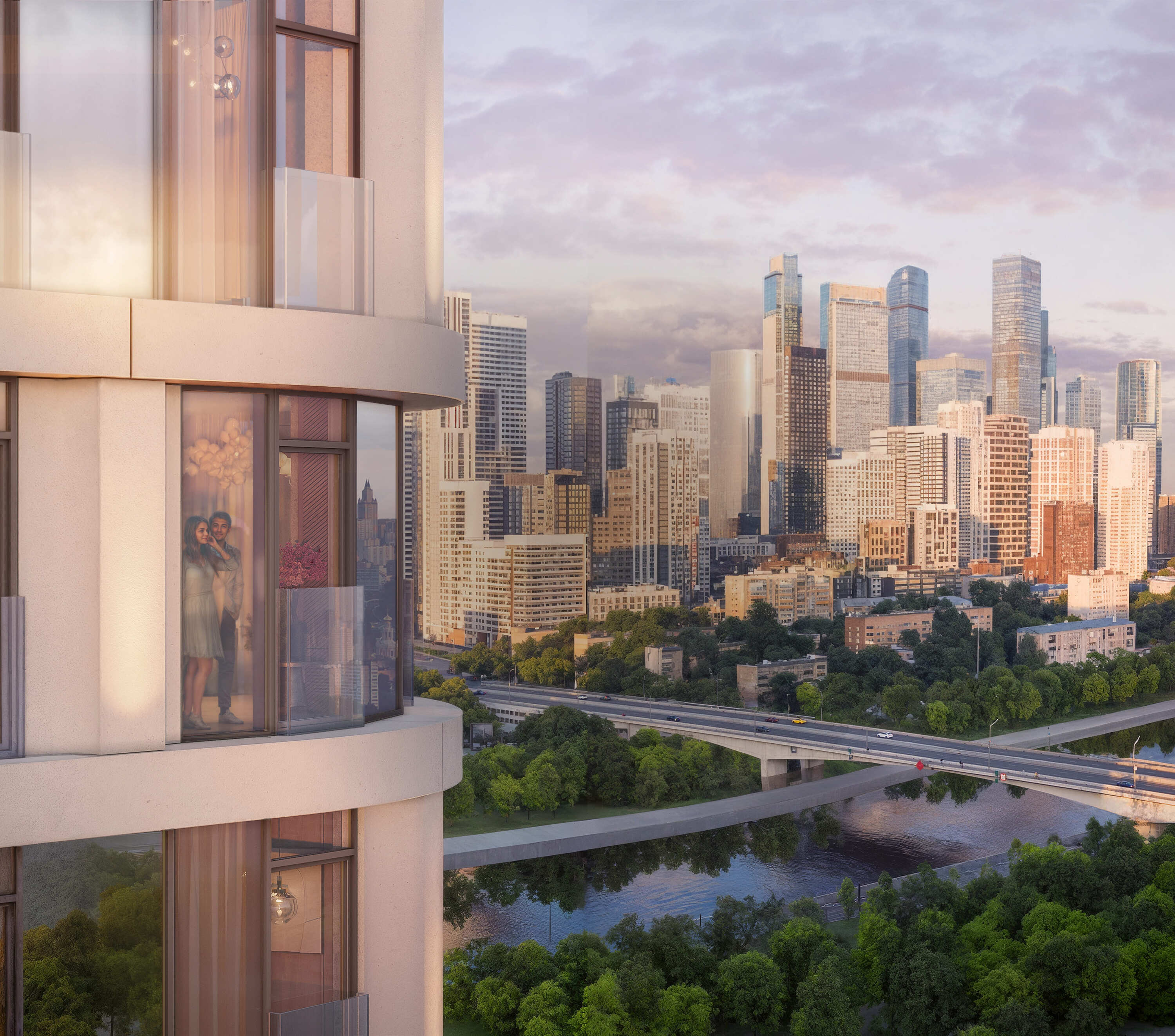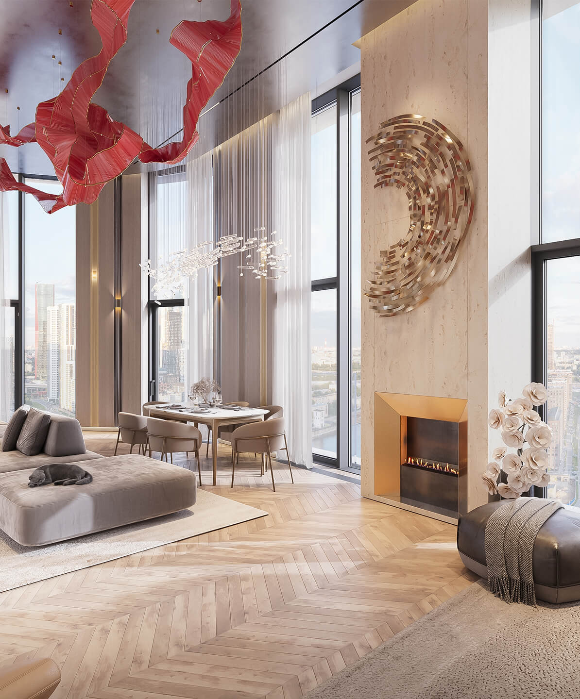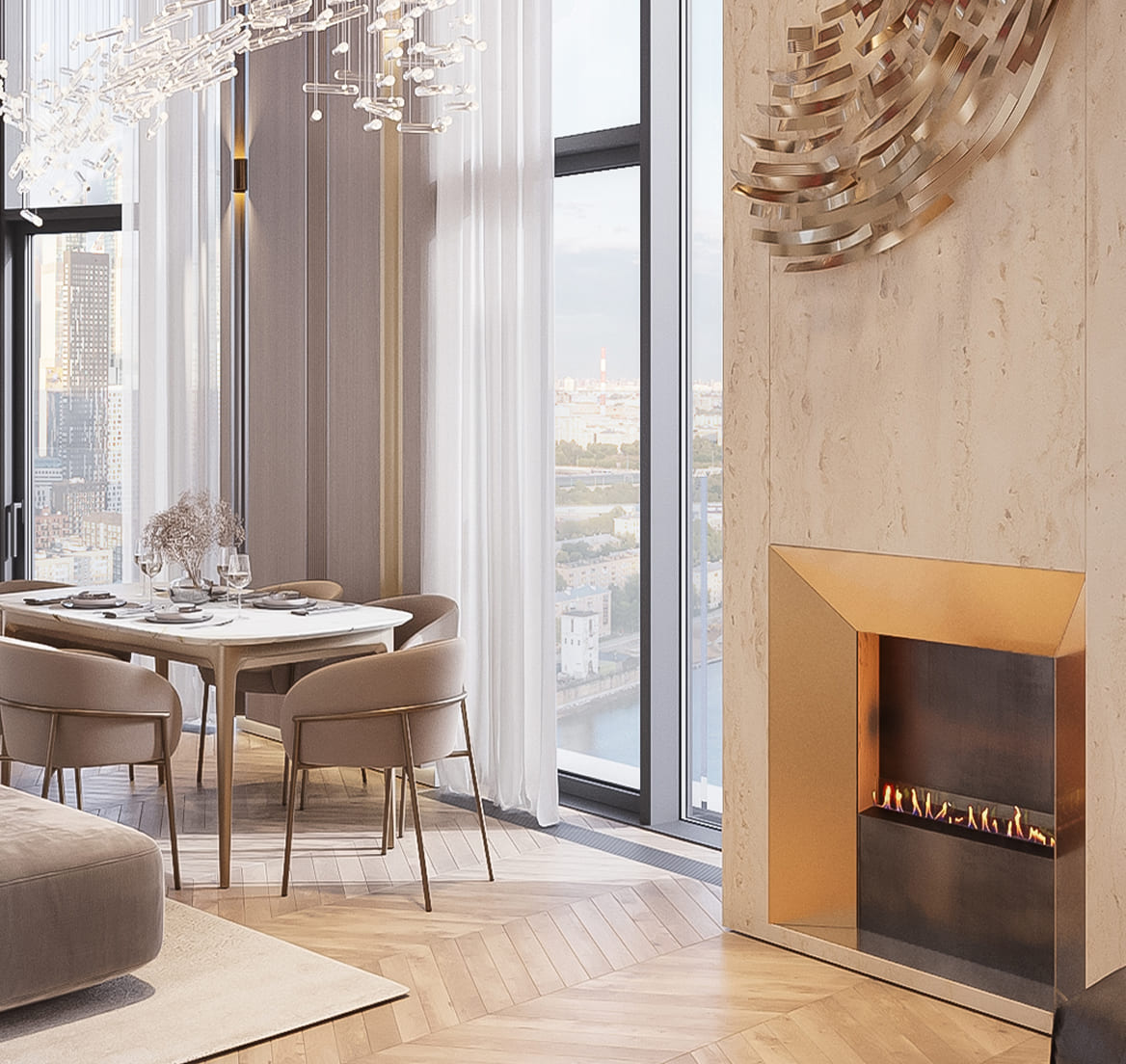 Светлые 5-метровые окна открывают безграничные панорамы. Природа стремится стать драгоценной изюминкой ваших интерьеров, впуская в эти окна всю красоту небесных пейзажей. А собственная лоджия превращается в ваш личный зелёный сад, парящий над землёй на высоте более 90 метров.