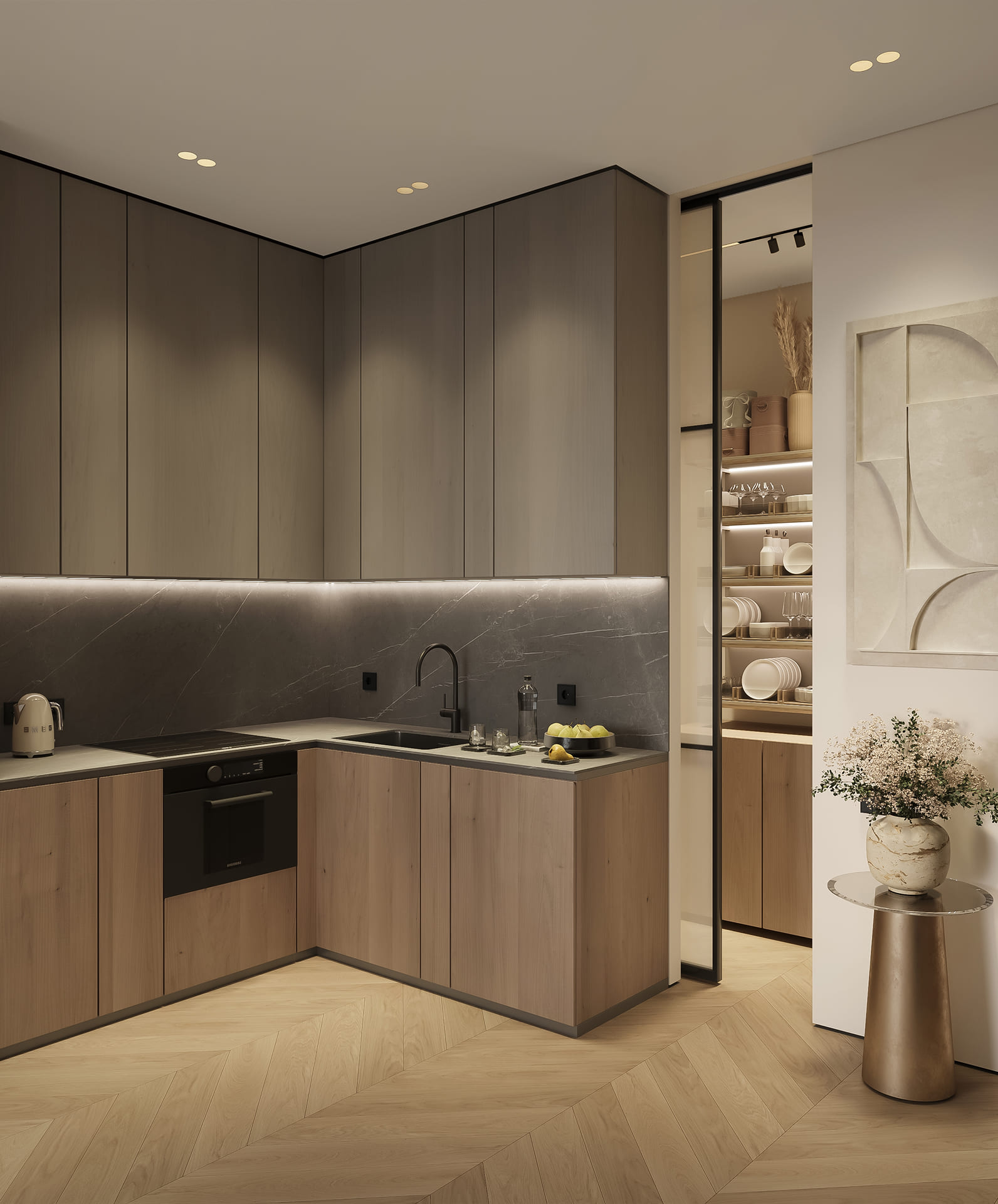 Кладовая, подобно гардеробной в спальне, упорядочит вещи, позволяя организовать пространство с максимальной эффективностью и эстетикой. Наслаждайтесь дизайном без визуального шума: только современный минимализм вашей кухни, гладкие фасады и свободные рабочие поверхности.