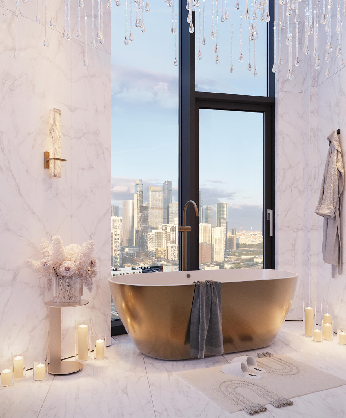 Когда ленивое настроение управляет желаниями, не стоит ему сопротивляться. Здесь всё так и зовёт принять ванну с пеной, медитативно созерцая ландшафт у ваших ног. Роскошь фешенебельного спа-салона и едва уловимая нотка нью-йоркской атмосферы — с вами в любое время, когда вам того захочется.
