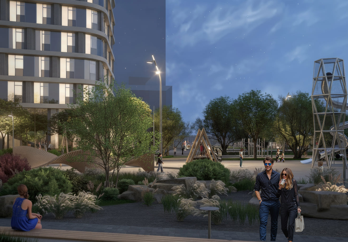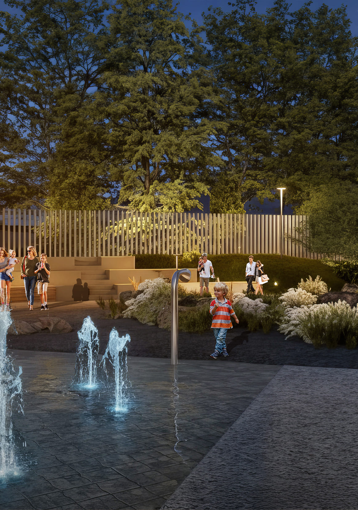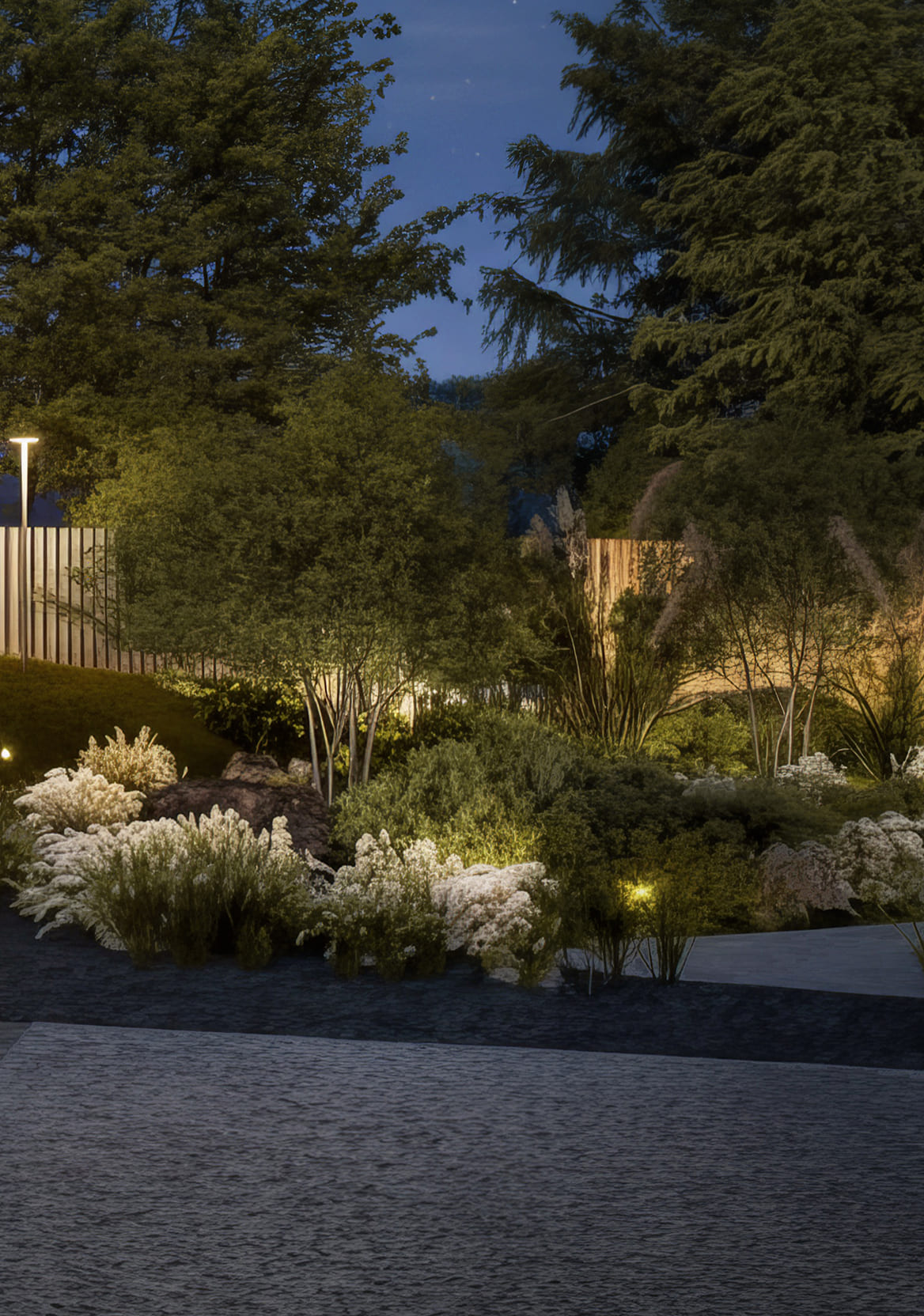 На закате сады превращаются в оду вашей перцепции. Зоны притяжения подчёркнуты декоративной подсветкой. В тихих уголках двора приглушённый мягкий свет создаёт атмосферу уюта и располагает к отдыху. А в интерактивных зонах цвета плавно мерцают и сменяют друг друга, направляя ваше внимание и побуждая исследовать пространство. Так же, как и в отделке дома, в освещении используется множество дизайнерских элементов.