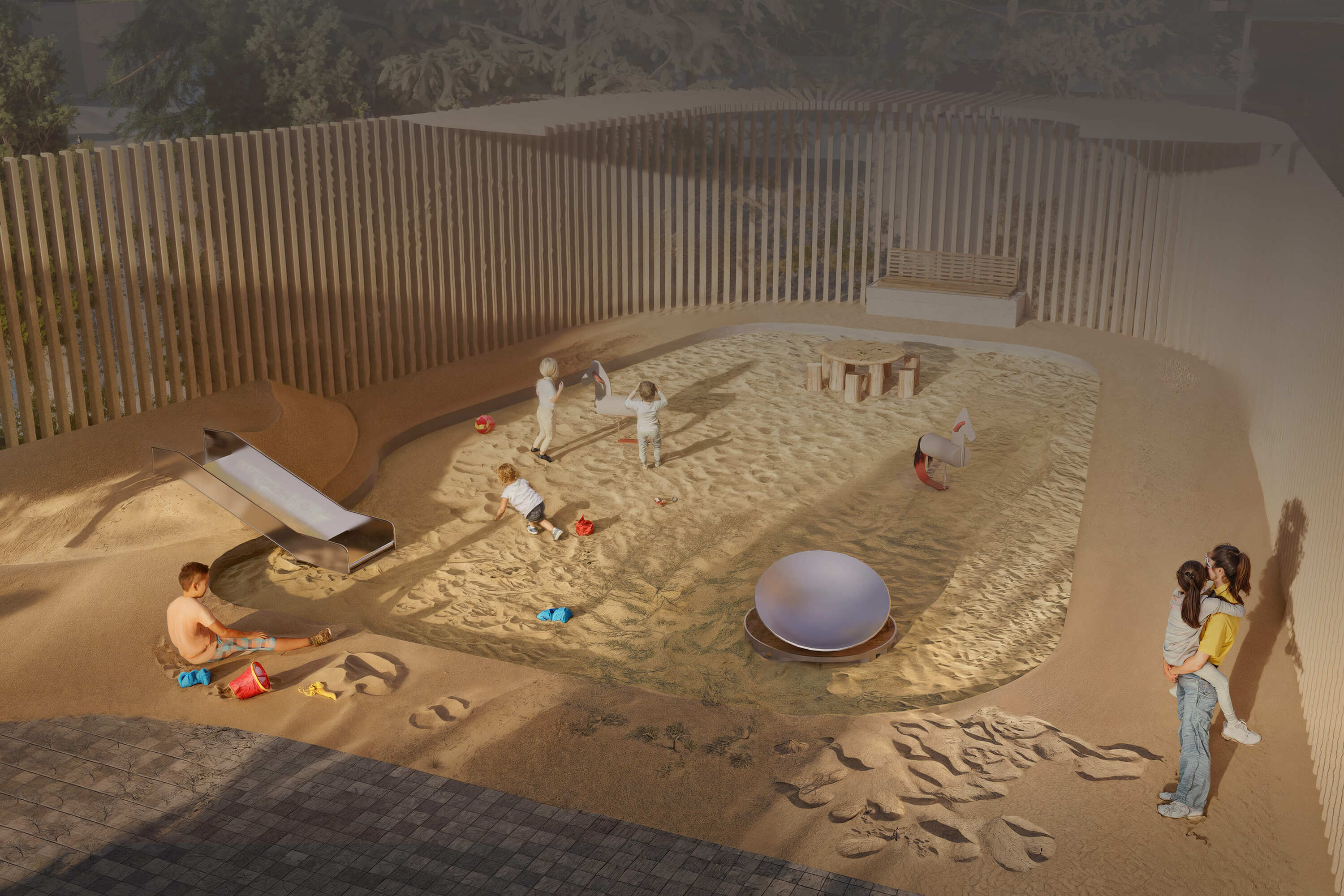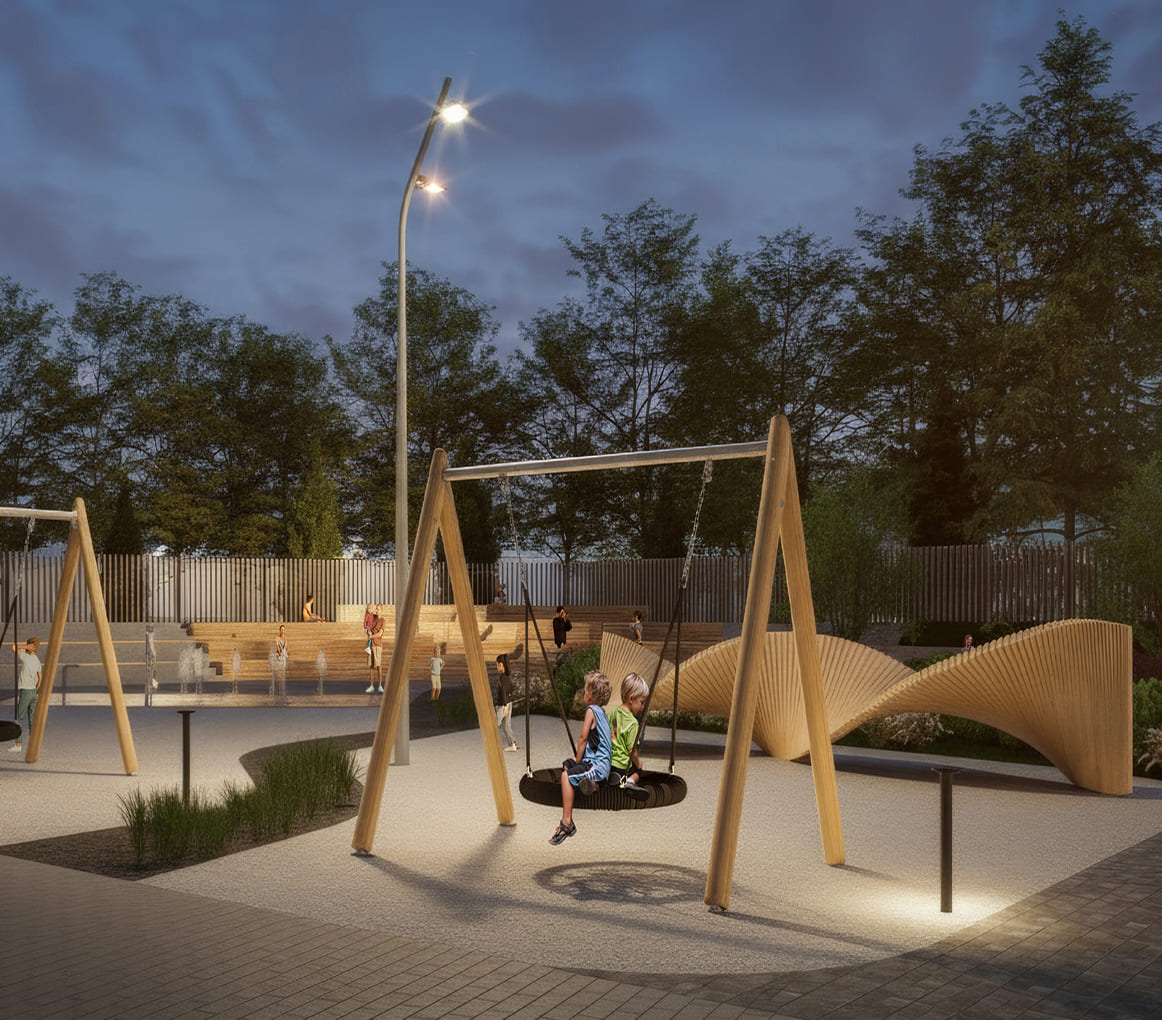 Детская игровая площадка разделена по всем канонам на возрастные зоны, чтобы каждому ребёнку нашлось развлечение по вкусу. Природные материалы — щепа, галька, песок и дерево — успокаивают. В то время как интерактивные аттракционы с ветряками из металла приводят малышей в восторг и движение.