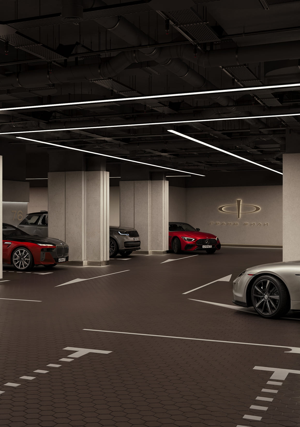 В Гранд Фили для сохранности ваших транспортных средств спроектировано три подземных уровня на 152 машино-места. Лифт с комфортом доставит вас в паркинг от самого порога квартиры, минуя пересадку в лобби.